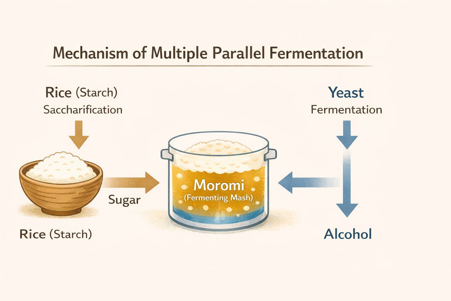 The key point is just one thing: the role that makes sugar (koji) and the role that makes alcohol (yeast) work at the same time. This is called parallel multiple fermentation.