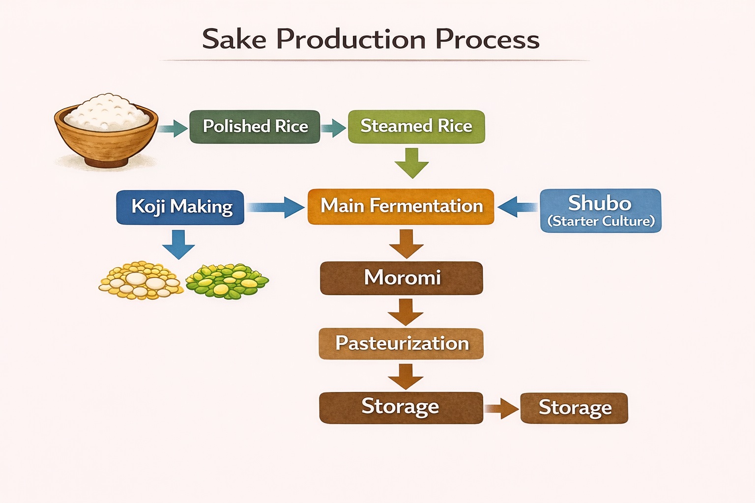 Koji makes sugar, and yeast makes alcohol. If you use this “simultaneous process” as your 중심 axis, the meaning of each step starts to connect naturally—like “Why do we grow yeast first in the starter?” “Why add ingredients in stages?” and “Why stop everything with pasteurization?”