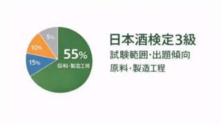 日本酒検定3級の試験範囲と出題傾向を整理。製造工程・特定名称酒・4タイプ分類などの重要度を分析し、合格圏の目安をわかりやすくまとめました。3級を受験する前に全体像を確認したい方へ。