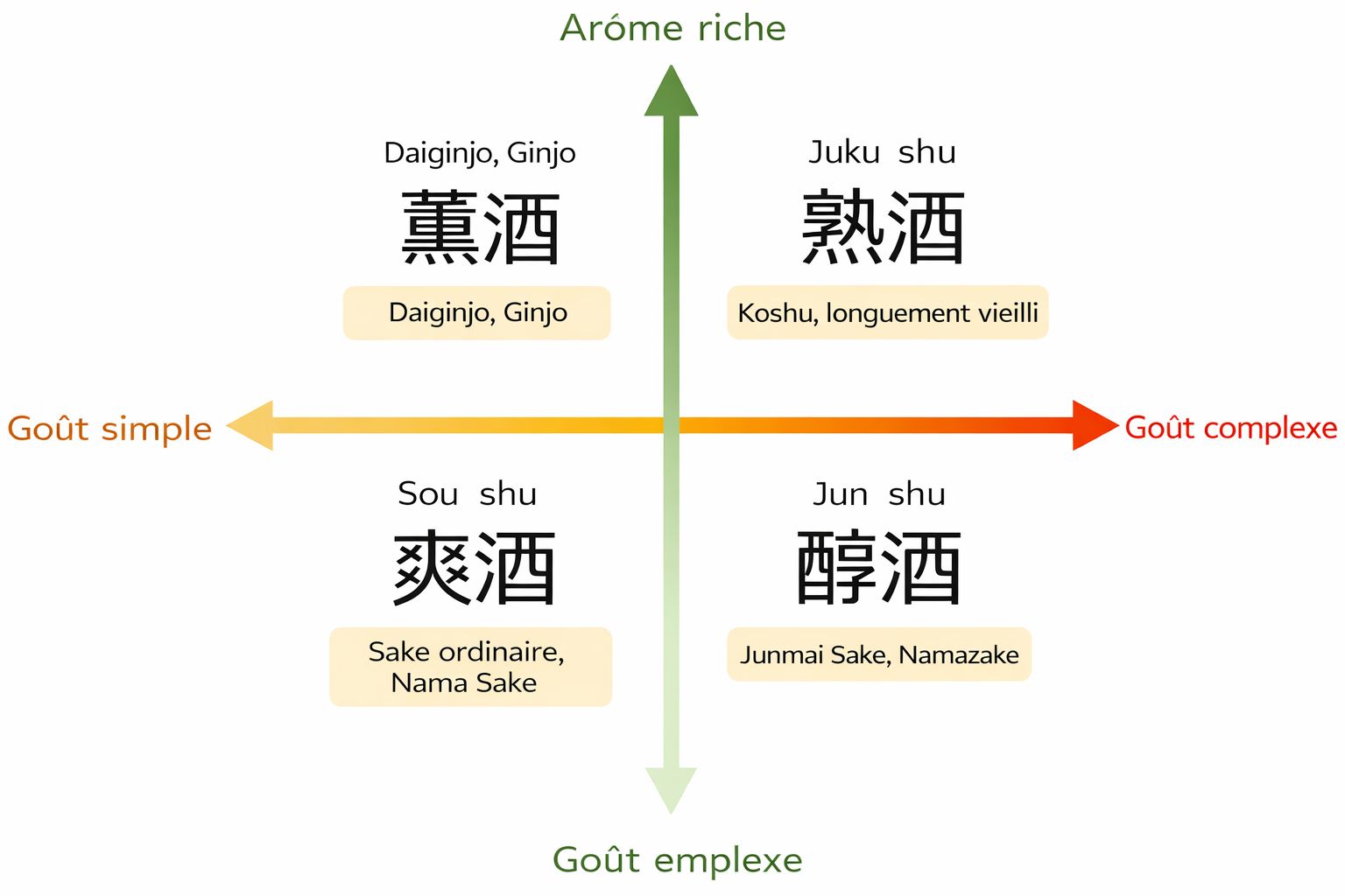Le saké peut être classé en quatre types selon ses caractéristiques aromatiques et gustatives : Kunshu(薫酒), Soushu(爽酒), Junshu(醇酒)et Jukushu(熟酒). Comprendre cette classification permet de choisir plus facilement un saké adapté à la saison.