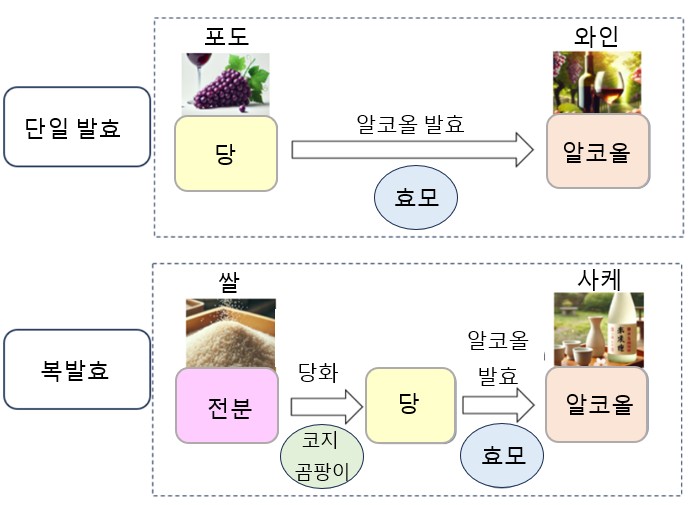 - 병행복발효: 당화와 발효가 동시에 진행됩니다 (사케).