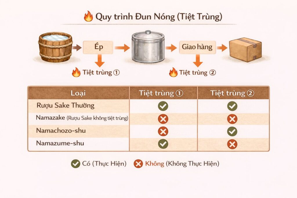 - Có 火入れ(ひいれ / hiire) — tức gia nhiệt tiệt trùng/pasteur hóa — hay không