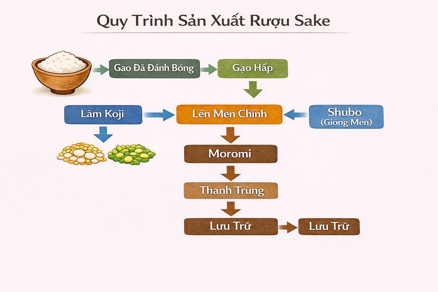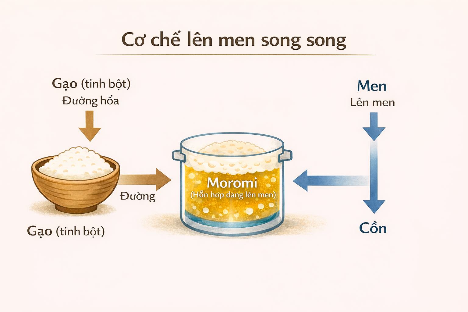 - Đường hóa: 麹(kouzi) chuyển tinh bột trong gạo thành đường.