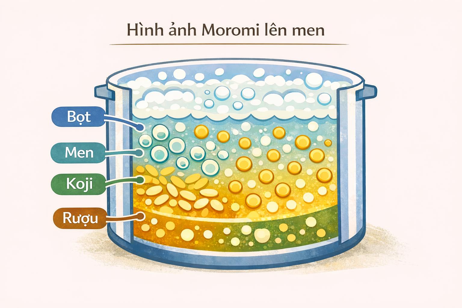 Trong giai đoạn 醪(moromi), 麹(kouzi), gạo hấp và nước được thêm vào 酒母 và quá trình lên men bắt đầu.